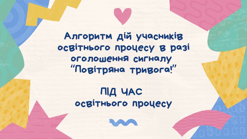 З алгоритмом дій учасників освітнього процесу в разі оголошення сигналу "Повітряна тривога!" ПІД ЧАС освітнього процесу можна ознайомитися за посиланням