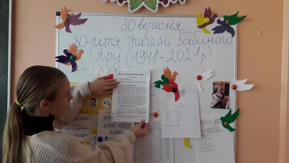 29 вересня відбувся Національний урок пам’яті до 80-х роковин трагедії Бабиного Яру. Учні нашої школи приєдналися до відзначення цієї пам‘ятної дати - у 6, 7-х класах проведено відкриті уроки пам’яті, вчитель - Головатюк Тамара Юріївна