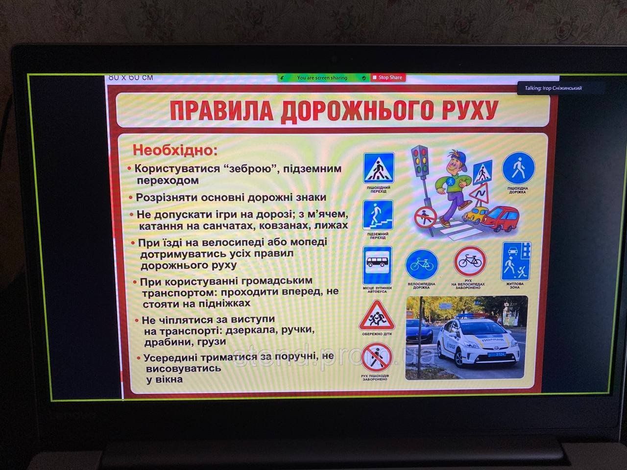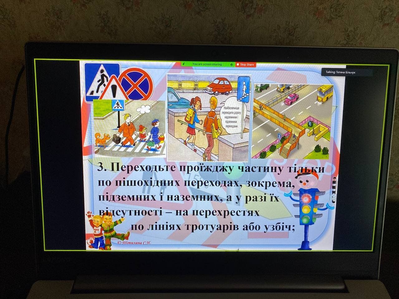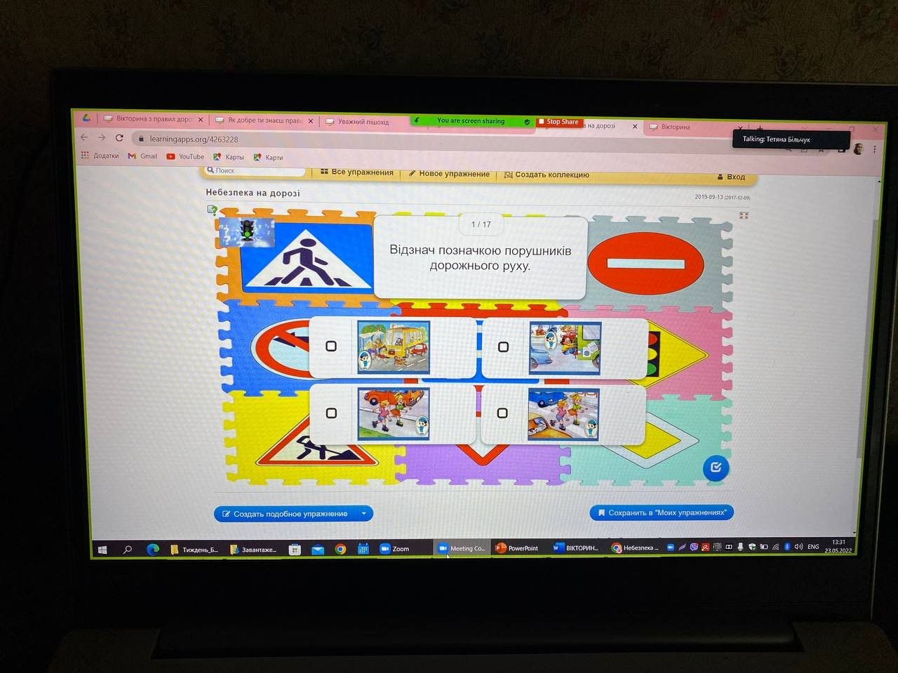 23 травня 2022 року для учнів 5-х класів, з метою підвищення їхньої безпеки проведено онлайн-урок з елементами гри з безпеки дорожнього руху «Правила дорожнього руху знай – життя та здоров’я зберігай!». Учні із задоволенням переглянули презентацію, повторили основні правила для пішоходів, розглянули, які бувають групи знаків, і закріпили матеріал за допомогою інтерактивних вправ Learning Apps.